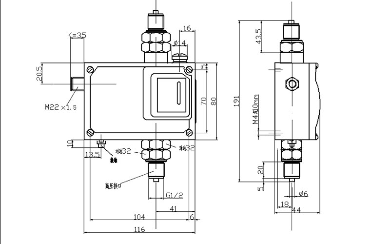 530/7DD差壓開關(guān)外形尺寸及安裝尺寸(單位:mm)