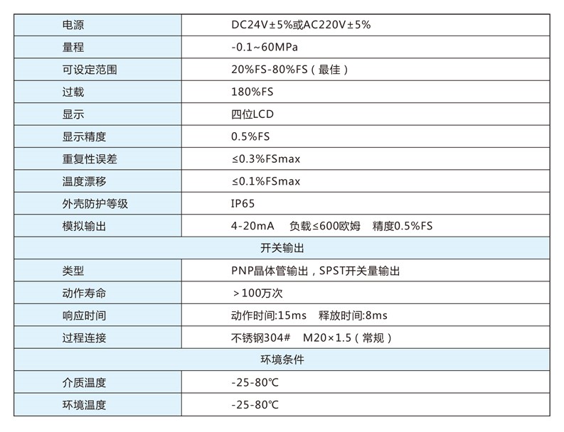 精度高,重復(fù)性好,壽命長,無膜片,無觸點,耐腐蝕性強,設(shè)定靈活方便,顯示直觀,溫漂小