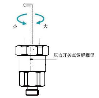 第二步:參照上圖螺絲刀調解壓力開關點大小,順時針方向調大,逆時針方向調小。